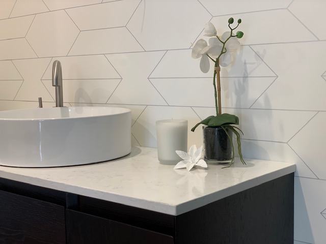 Follow the rules of creating a vignette, adding texture, colour, different heights and groupings to create a visual interest. Start with a tray to keep it all organized and tidy. For example, incorporate some natural elements ie plants for texture and colour, candles, ceramic bowls, soap bar …