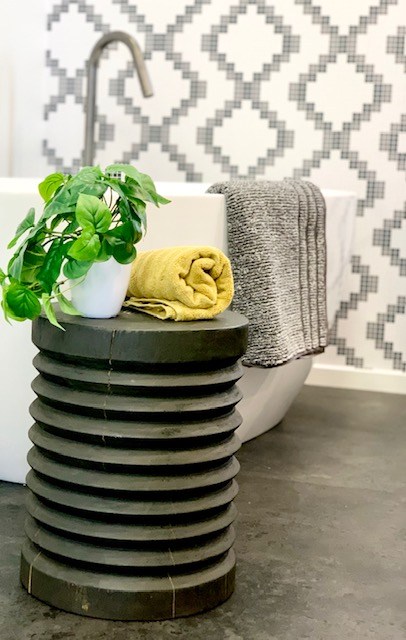 If you have the luxury of space and a bath add a feature stool beside your bath. It’s another functional surface that can be beautifully styled.